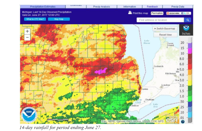 - Our crop condition is all over the board. We have had to do some replanting due to the wet soil conditions. Some are just starting to plant for the first time because it was too dry, and then too wet! I took a ride out to Caseville yesterday – there are a lot of holes in fields out that way. Post weed control application has begun. If I had to sum it up in one word, our crop is “Fair.